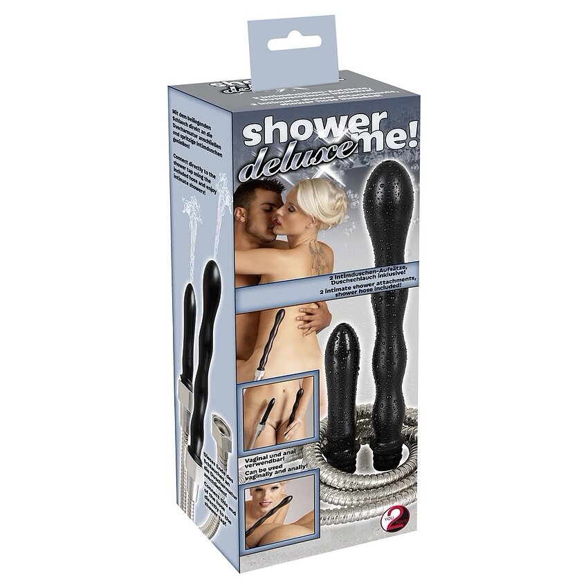 Shower Me Deluxe este un irigator care are două capete: unul pentru fund și unul pentru vagin, în concluzie poate fi folosit pentru îngrijirea ambelor organe intime. Dacă ești pasionat de jocuri intime, încearcă Shower Me Deluxe și bucură-te de o irigare completă, de calitate. Fiecare punct final are o gaură în vârf prin care să iasă în jet mic de apă.