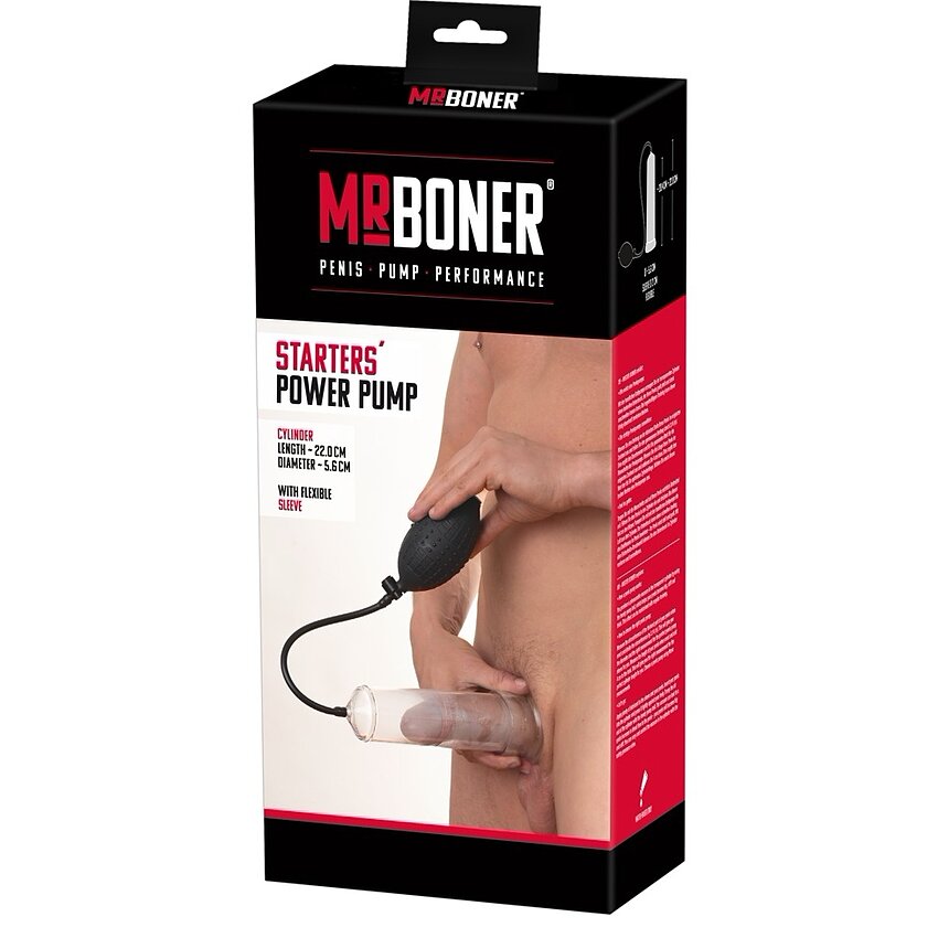 Pompă Penis Mister Starters conferă o metodă de mărire a membrului eficientă. Pompă cu cilindru străveziu lung 22cm și pompă de mână cu furtun de cauciuc și buton air release.