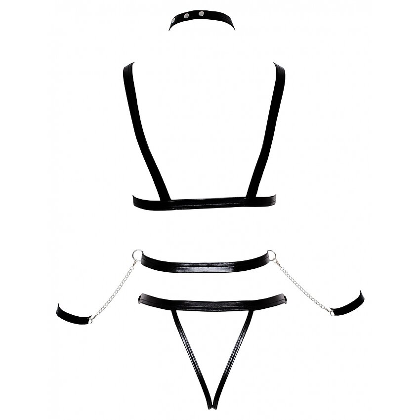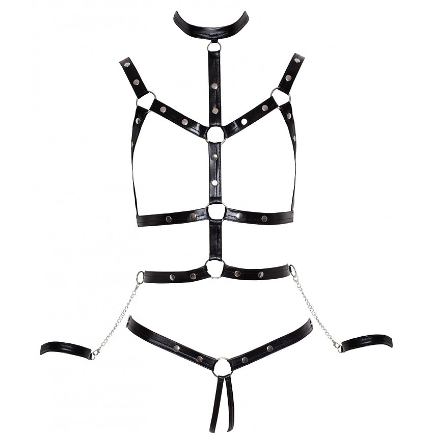 Stil cu hamuri seducătoare și cătușe! Set seducător și elegant, făcut ca un ham cu știfturi. Este alcătuit din două bucăți, există lanțuri scurte cu cătușe înguste la capătul lor care sunt conectate de corp. Ținuta sublimă pentru neexperimentați și experți în jocuri de obraznice obraznice. Materialul finit este fabricat dintr-un material flexibil si se potriveste marimilor S si M.