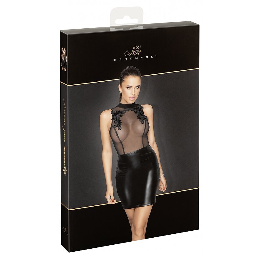 Rochie cu gât înalt care este provocator deschisă în spate! Rochie elastică, minus mâneci, cu stil mulat. Rochia este fabricată dintr-un melanj elegant de rețea (partea de sus) și aspectul umed dominant (partea fustei).