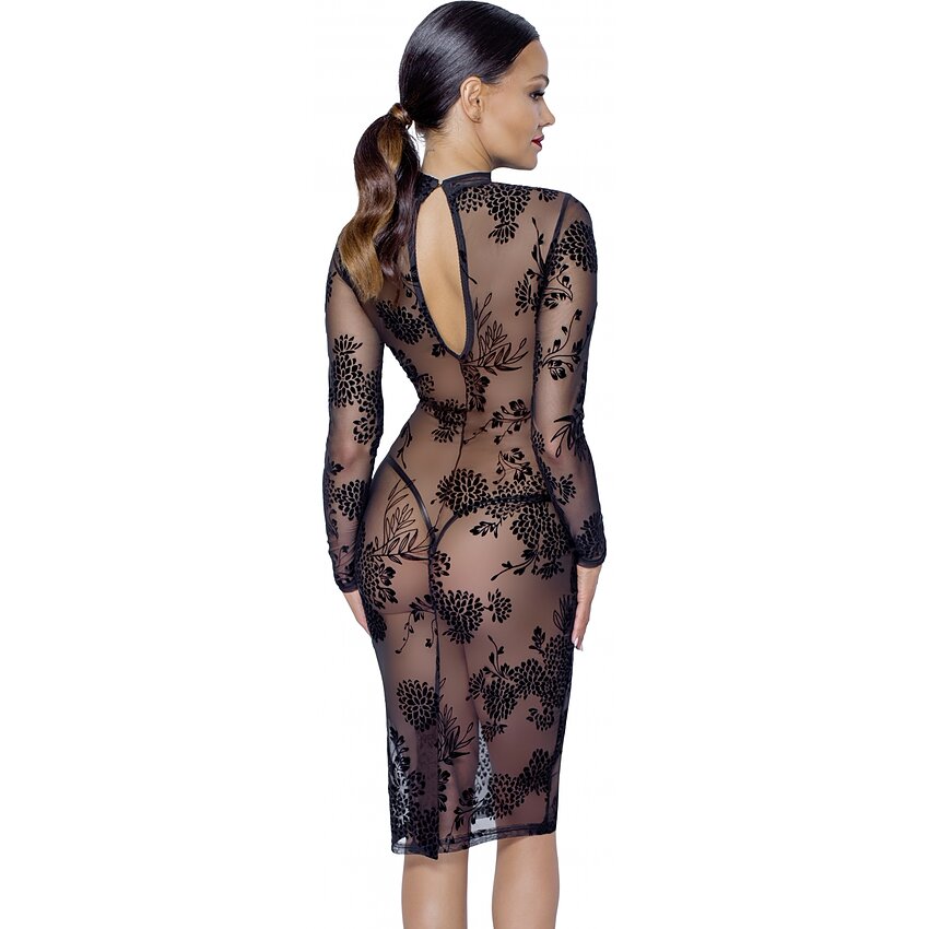 Transparența delicată într-un design exclusiv! Rochie cu mâneci lungi de la Noir, care este realizată complet din plasă elastică și are un imprimeu catifelat de catifea într-un stil floral. Mărime până la genunchi, cu o fantă îndelungă de 18 cm pe spatele rochiei. Gulerul ridicat este închis cu un nasture mic care se află deasupra decupajului ovale din spate.