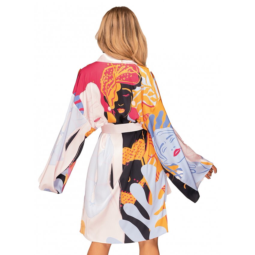 Un capot stil kimono, conceput din material catifelat și delicat. Țesătura sa frumoasă, multicoloră, înfățișează trei soții în îmbrăcăminte intimă. Mânecile lungi și largi face o impresie unică și adaugă sex-appeal și eleganța produsului. Produsul este făcut dintr-un material extensibil si se potriveste marimilor S si M.