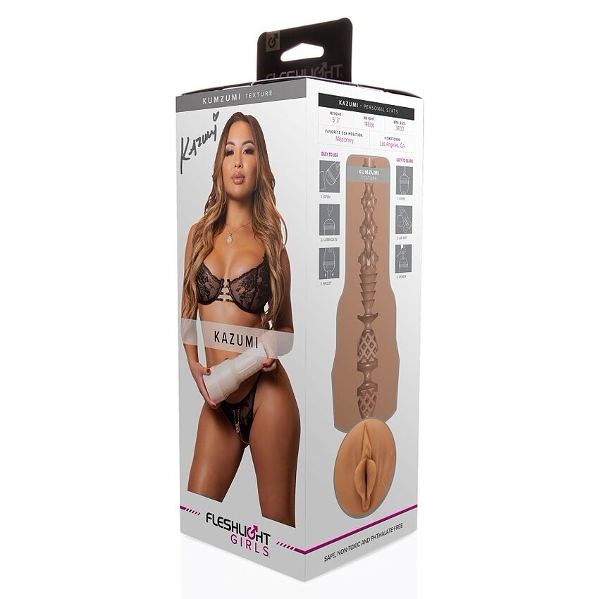 - Fleshlight Kazumi este o replică realistică a vaginului celebrei creatoare de conținut și vedete adulte, Kazumi. - Masturbatorul are deschiderea modelată după vaginul original al starului adult Kazumi. - Manșonul interior are autograful lui Kazumi aproape deschidere.