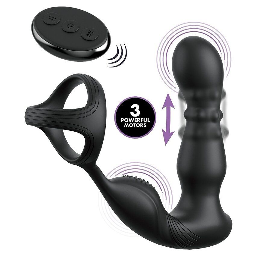 Vibrator anal reîncărcabil cu masaj prin perle și stimulator perineal, 10 aplicații (3 viteze + 7 moduri), inel flexibil de susținere, telecomandă și blocare pentru transport. Rezistent la apă, silențios, silicon premium.