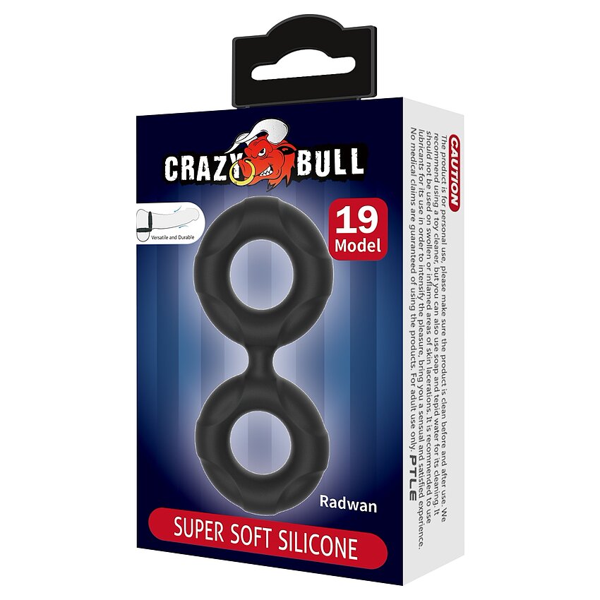Inel dublu din silicon super-moale Crazy Bull Radwan Tip 19, zămislit pentru susținere și fermitate prelungită. Se potrivește confortabil pe ax, sprijinind la întârzierea orgasmului și la intensificarea plăcerii, fără componente vibrante.