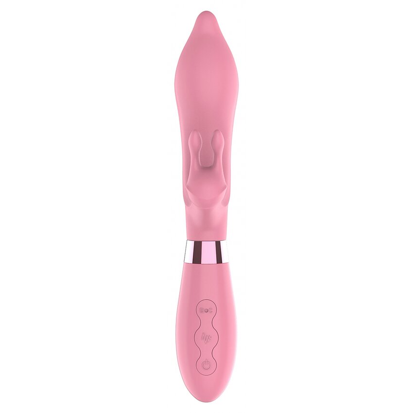 Love Bunny de la ToyJoy: vibrator roz, ax flexibil și stimulator clitoridian. Silicon hipoalergenic, reîncărcabil USB cu acumulator Li-ion, IPX5. 7 moduri pulsație, 3 viteze pentru reglaje precise.
