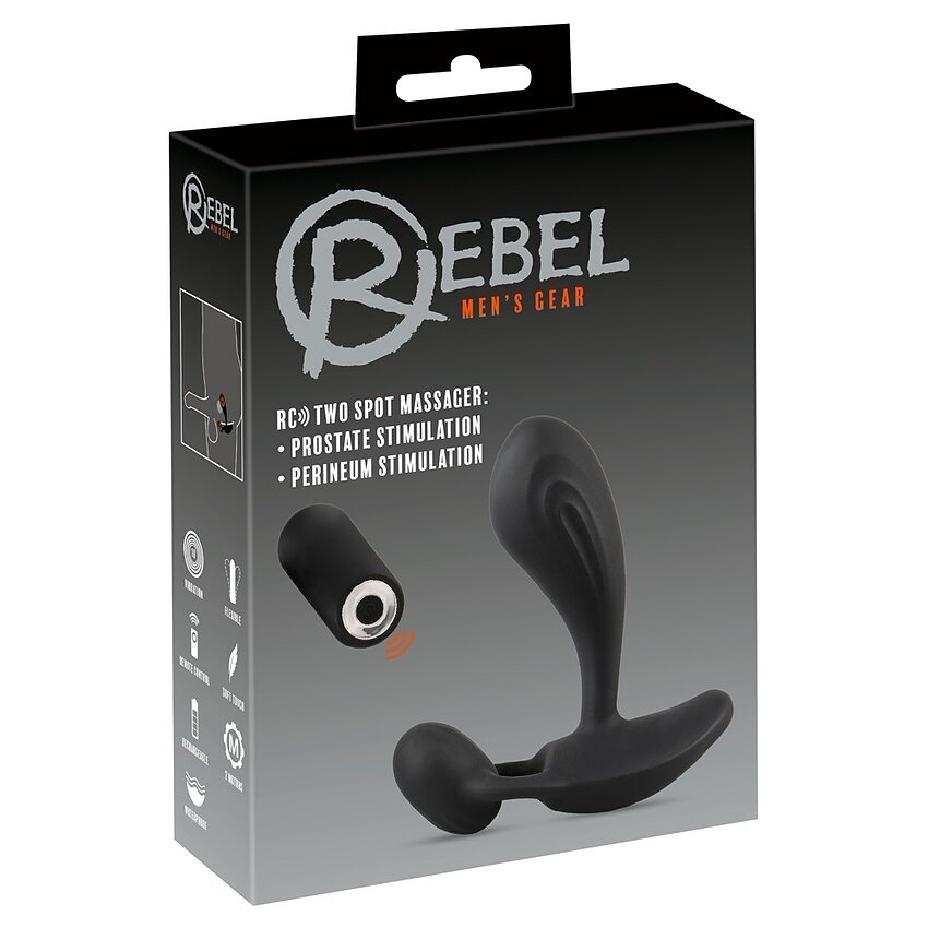 Vibrator anal compact Rebel Two Spot Massager: două motoare, 10 maniere de vibraţie, telecomandă cu rază de 10 m, silicon Soft Touch, cu acumulator USB şi 100% zdravăn la apă. Dimensiuni compacte pentru inserare confortabilă.