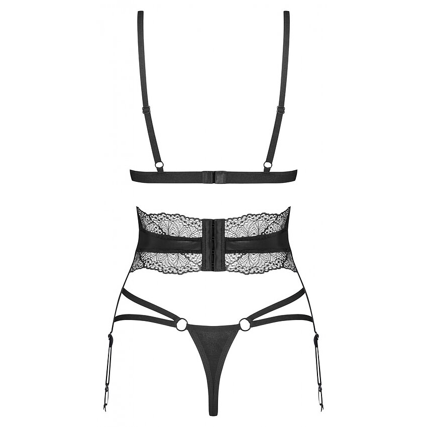Set Lobellis de la Obsessive: sutien, centură cu jartiere și chilot cu ață în negru, dantelă și material catifelat. Bretele și jartiere reglabile, închidere cu cârlige la spate. Produs în UE, nickel-free. Se livrează excluzând ciorapi.