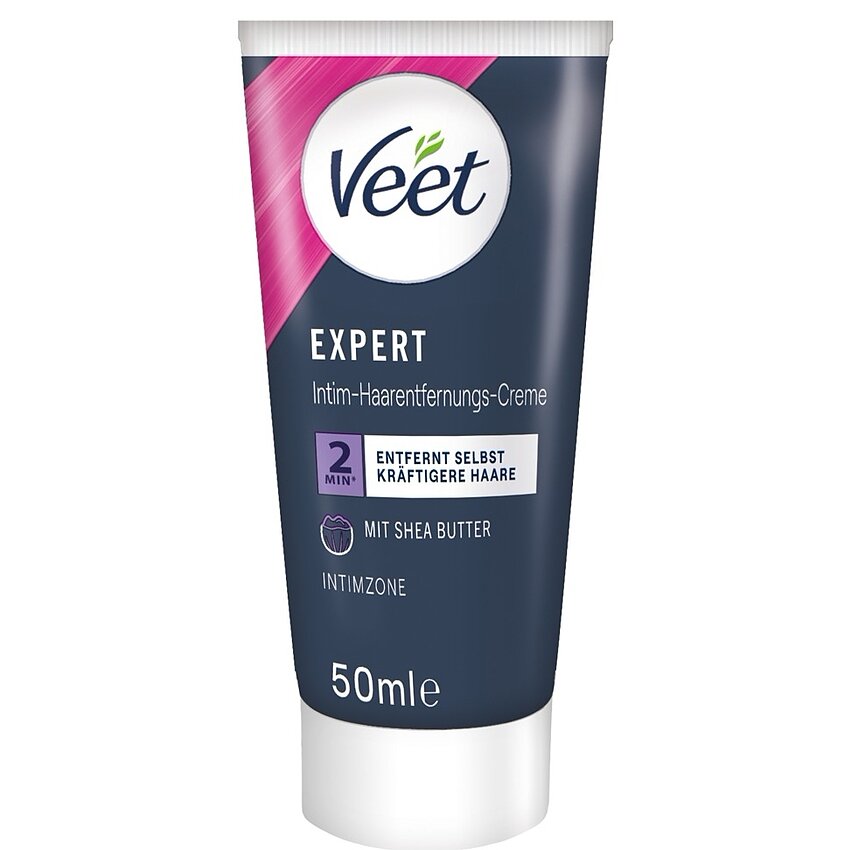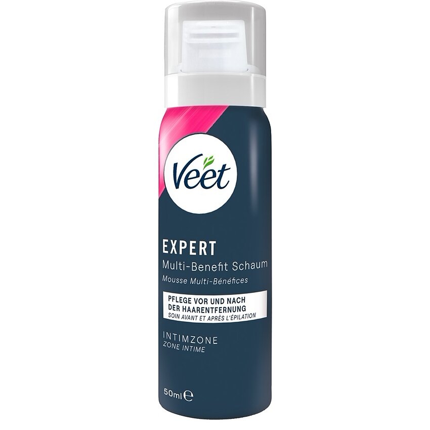 Set Veet EXPERT pentru zona intimă: cremă depilatoare 50 ml (spatulă inclusă) și spumă multifuncțională 50 ml. Îndepărtează firele groase în circa 2 minute, hidratează până la 48 ore și calmează pielea sensibilă.