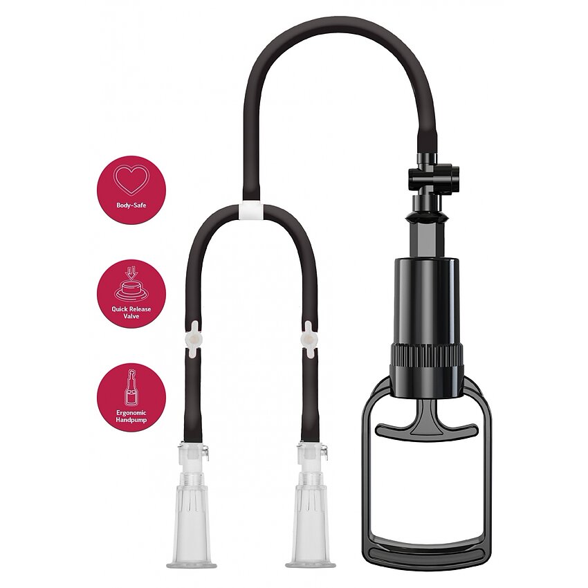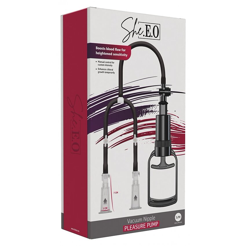 Pompiță vacuum She EO pentru stârnire a sfârcurilor: aplicare simplă, pompă manuală pentru vid controlat, supapă ce menține aspirația după îndepărtarea furtunului/pompei și eliberare rapidă. Crește receptivitatea și senzațiile locale.