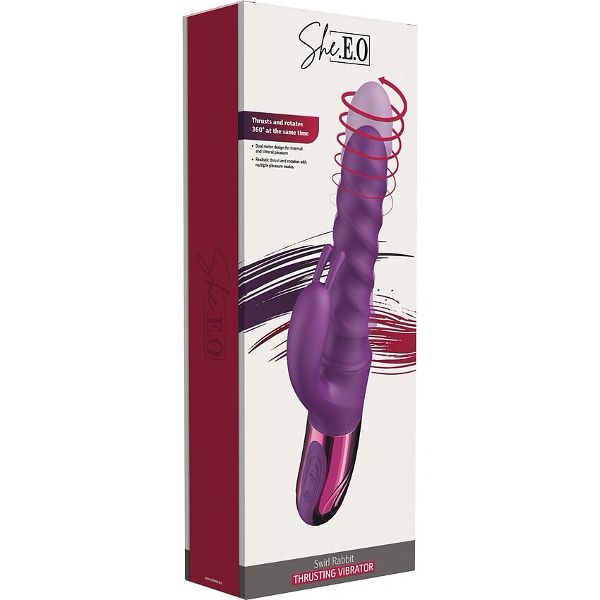 Swirl Bunny de la She EO combină o rotaţie desăvârșită de 360° cu un mecanism de împingere pentru stârnire internă intensă și ritmică. Shaftul inserabil se roteşte în jurul axei în timp ce execută vibrații sus-jos, imitând o senzație dinamică și controlabilă.
