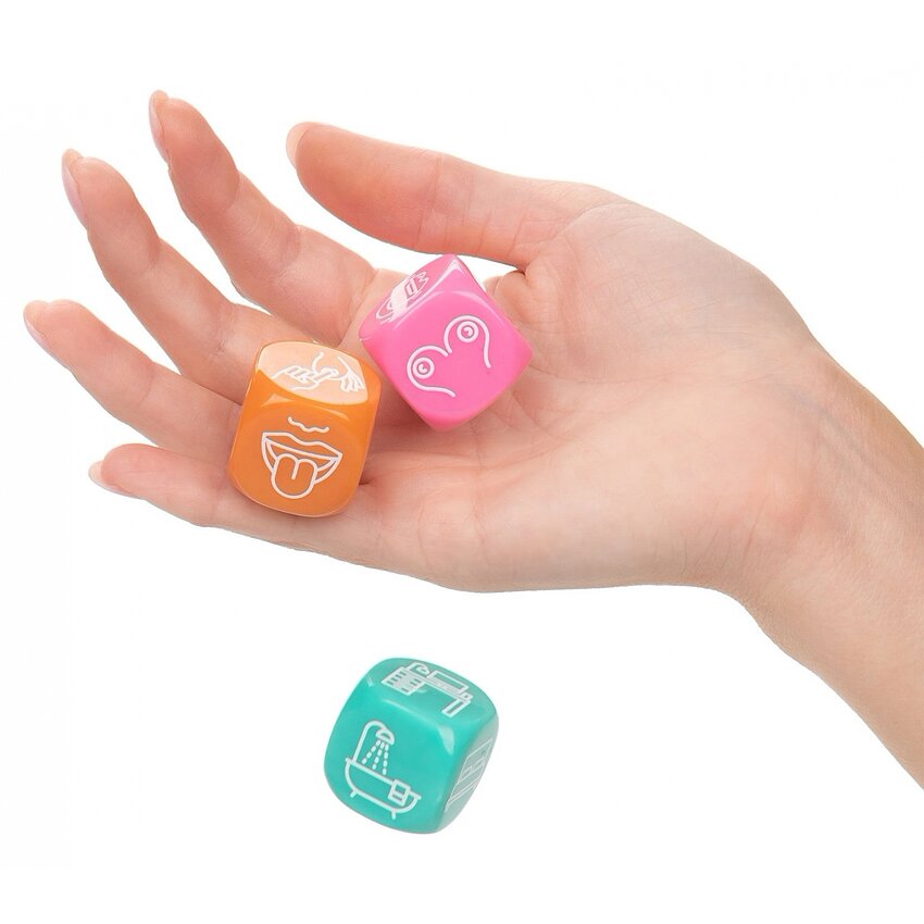 Set compact Roll With It de la CalExotics: 3 zaruri din acrilic pentru a stabili fără întârziere partea, acțiunea și locul. Tacit, reutilizabil și ușor de păstrat pe noptieră. Pentru adulți, folosiți cu respect.