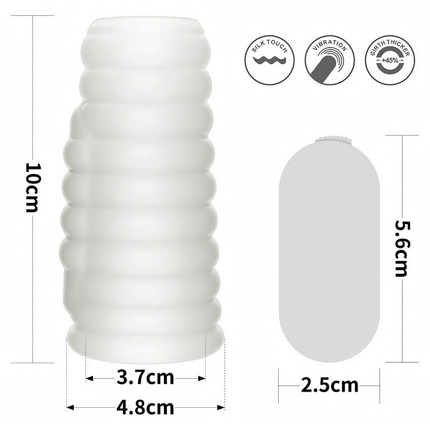 Caracteristici şi beneficii: - Creşte circumferinţa cu 45% pentru o senzaţie mai plină - Vibraţii pentru stimulare comună, cu control simplu - Material TPE, fără latex şi fără ftalaţi, sigur pentru corp - Zdravăn la apă, uşor de curăţat şi reutilizabil - Elastic, rezistent la rupere şi adaptabil formelor anatomice - Include 1 baterie CR2032 pentru funcţionare imediată