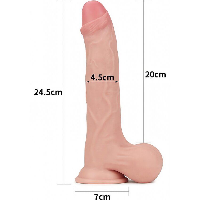 Dong 24.5cm din material Sliding Skin înveliș dublu: exterior moale şi miez ferm pentru senzaţie naturală. Confecționat manual, flexibil, include testicule complete. Potrivit cu lubrifianţi pe bază de apă; curăţare uşoară.