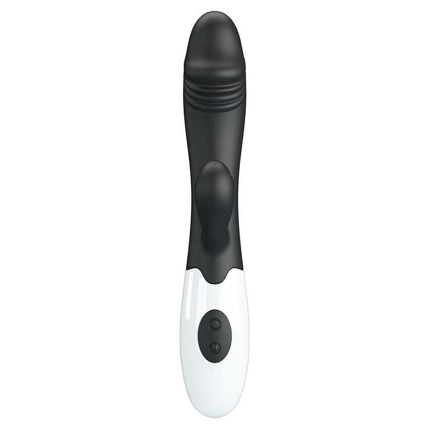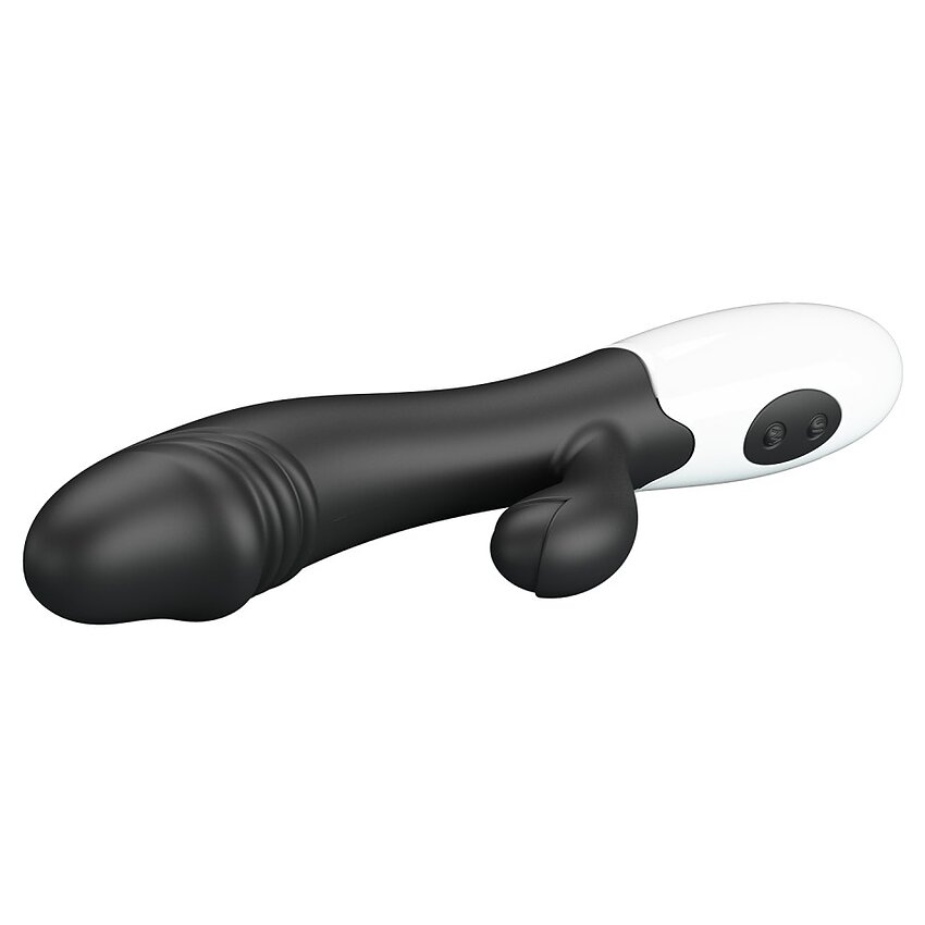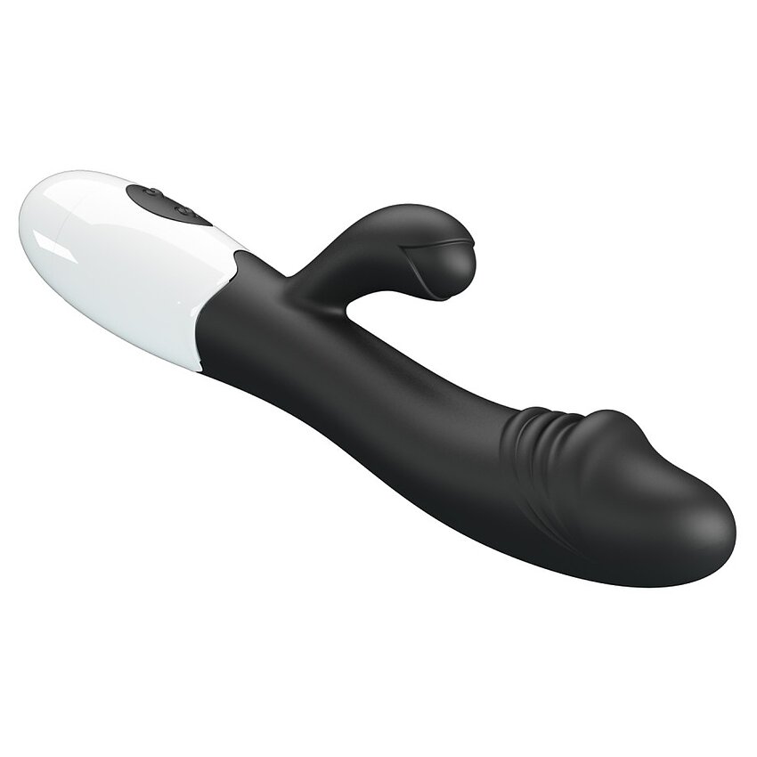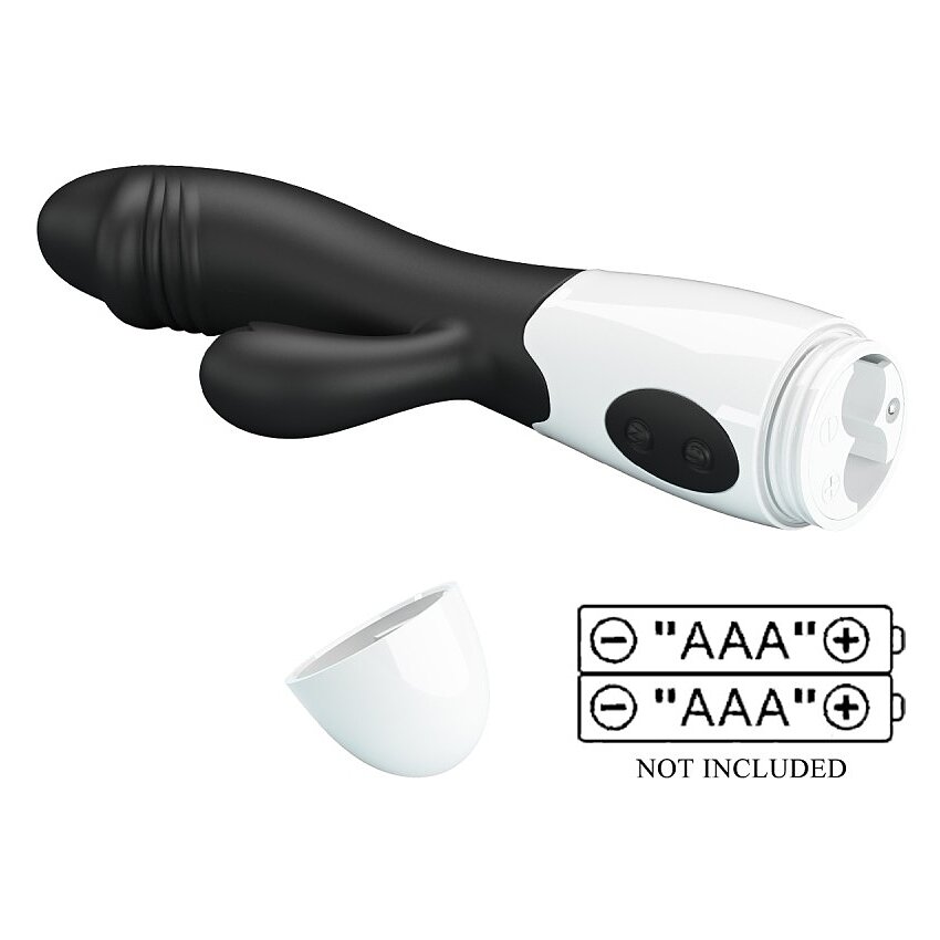 Vibrator bunny Pretty Love Snappy Black: braț maleabil pentru atingere constant cu punctul G și clitorisul. 30 chipuri de vibrație, controale intuitive și pornire separată a motoarelor. Viguros la apă. Alimentare: 2 x AAA.