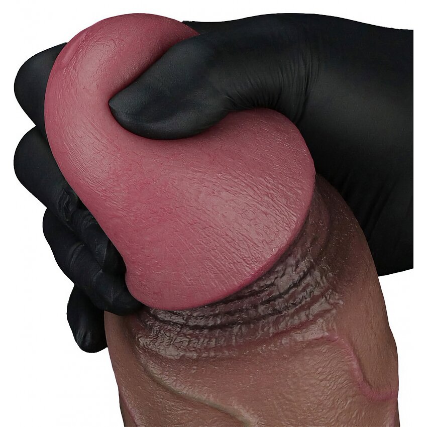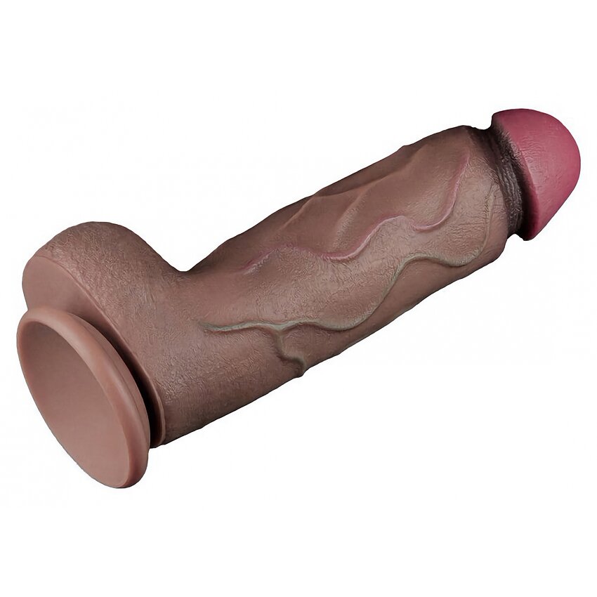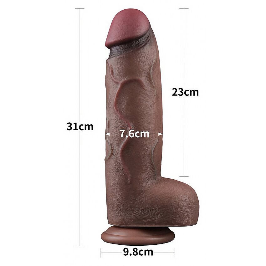 Realist Lovetoy din silicon cu două straturi — 31 cm întreg (23 cm inserabili), calibru 7.6 cm. Cap rotunjit, textură discretă și bază cu ventuză pentru fixaj hands-free. Alură maro. Ușor de curățat.