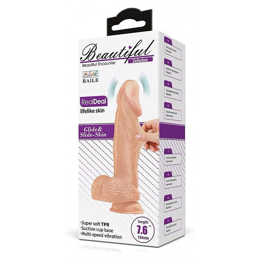 Vibrator realist Pretty Love Zebulon, 19,4 cm: exterior din TPR jelly și miez ferm, ventuză intensă pentru utilizare hands-free și tele-comandă cu fir pentru reglaj fin al vibrațiilor. Waterproof, curățare ușoară.
