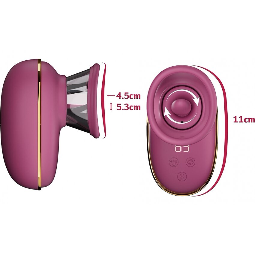 Alege dintre 9 moduri de rotație și vibrație și 3 nivele de vacuum pentru ajustare fină. Cupa de vacuum crește circulația locală, iar limba rotativă poate fi întrebuințată și independent, cu un acces mai adânc pentru stimulare concentrată.