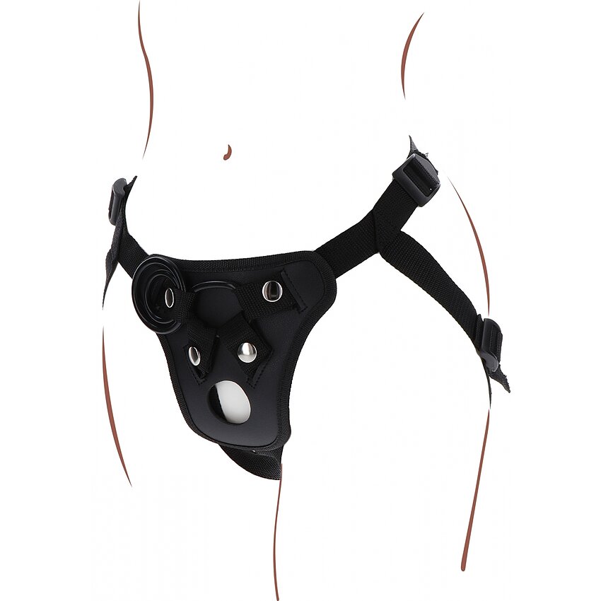 Ham Strap-On TOYJOY, negru, cu pernă frontală căptușită și centuri reglabile. Include 3 inele din silicon (Ø 3.5, 4.5, 5 cm) și buzunar pentru vibrator mic (neinclus). Fixare sigură și confort adaptat pentru cuplu.
