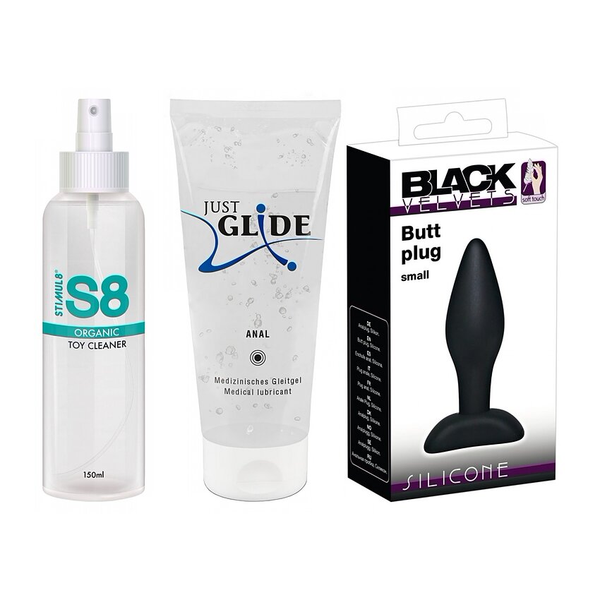 Detalii și beneficii ale fiecărui element: - Dop anal din silicon (Black Velvets): silicon moale, suprafață catifelată, vârf conic pentru inserție ușoară. Mărime globală 9 cm, inserabil 7 cm, diametru 2.6 cm; bază largă pentru manevrare sigură. Materialul oferă senzație naturală, flexibilitate și confort la purtare. - Lubrifiant Anal Just Glide (200 ml): formulă pe bază de apă, pH optimizat, vegan și testat dermatologic. Conferă lubrifiere de durată, nu lasă pete și este compatibil cu prezervativele din latex și cu majoritatea jucăriilor. Corespunzător pentru pielea sensibilă, limitează frecarea și riscul de iritații. - Atomizator organic dezinfectant Stimul8 (150 ml): procedeu fără alcool, pH neutru și antialergic, compatibilă cu silicon, plastic, metal și sticlă. Elimină bacteriile lipsit de a deteriora materialele și nu conține parabeni sau ftalați; menține igiena și prelungește viața jucăriilor tale.