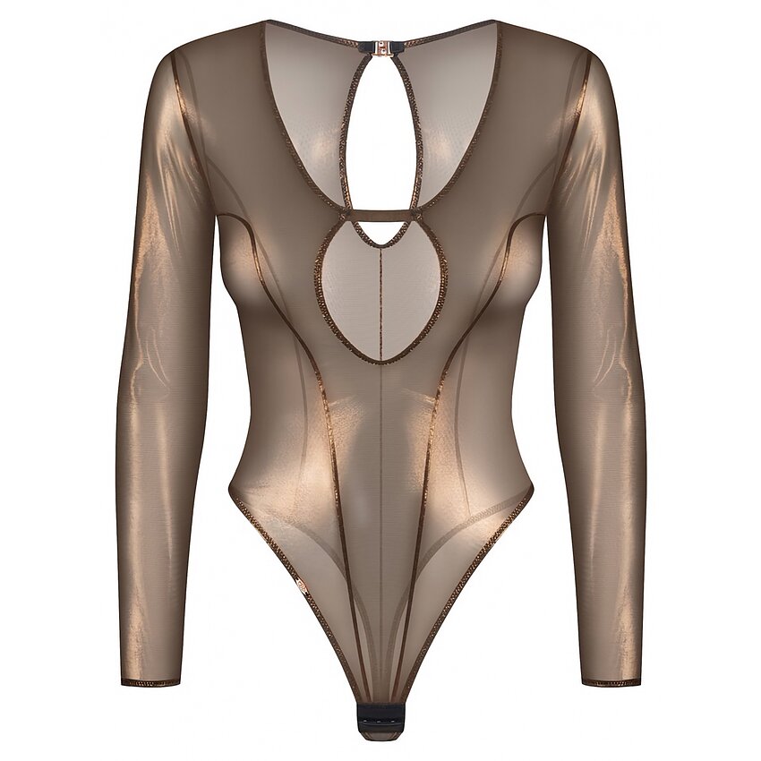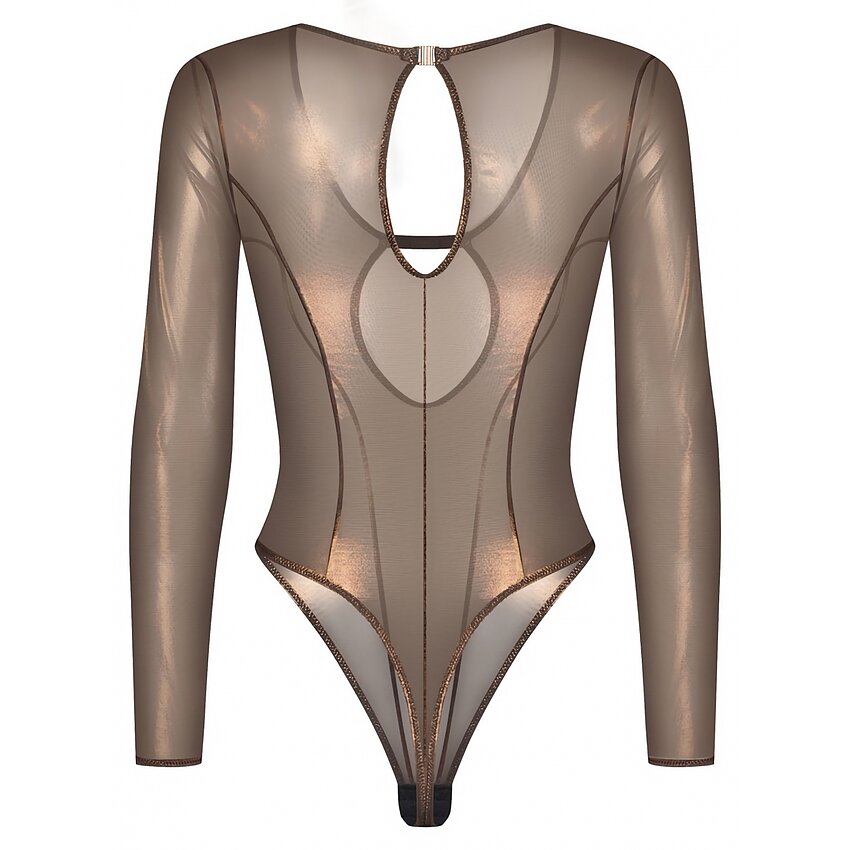 Body Soranna de la Obsessive atrage priviri prin nuanța bronz cu un ușor strălucire elegant. Croiala tip thong și tăietura înaltă a piciorului alungesc silueta, iar decupajele dau o notă rafinată.