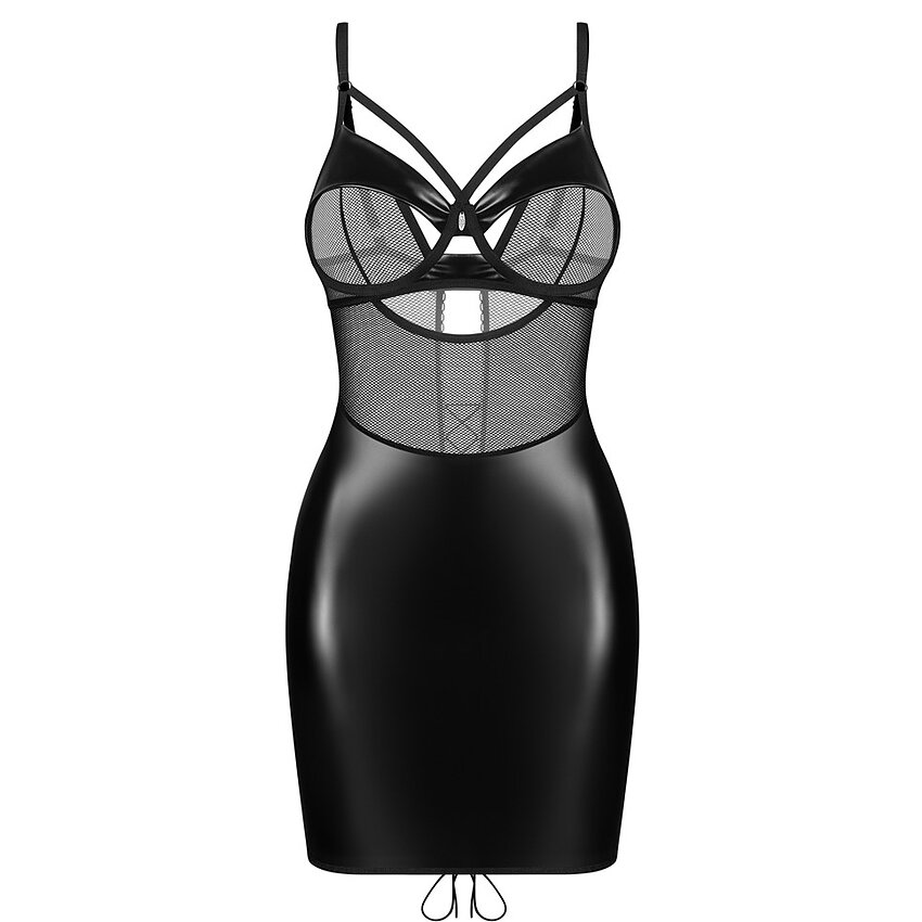 Setul Dominna de la Obsessive asigură un aer îndrăzneț și rafinat, potrivit pentru momente îndată ce vrei să te simți puternic. Chemise-ul pune în valoare linia trupului prin combinația de plasă transparentă în partea superioară și wetlook opac în fracțiune de jos.