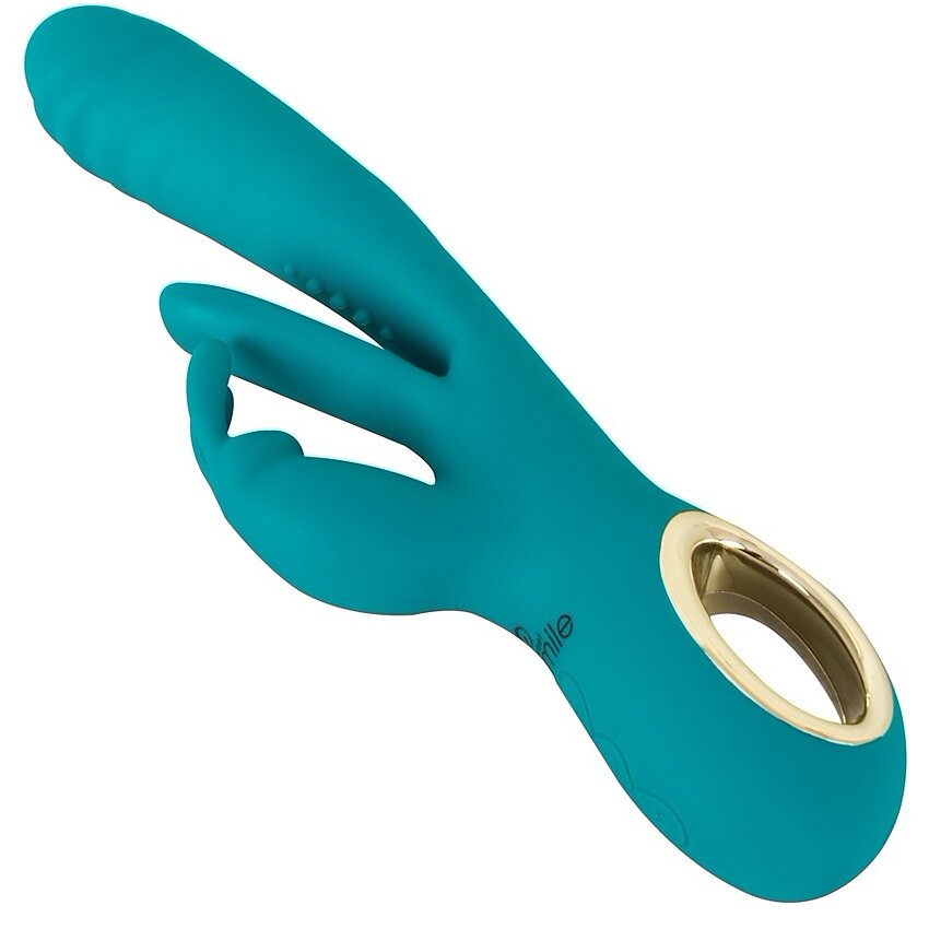 Iepurașul Sweet Smile oferă stimulare multiplă cu 3 motoare: cap canelat cu funcție de împingere (7 viteze), limbă grabnică (7 viteze) și braț flexibil pentru clitoris. 10 moduri, reîncărcabil USB, impermeabil, silicon catifelat, mâner inelar pentru control confortabil.