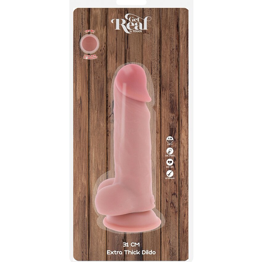 Replică autentică Get Real Deluxe de la ToyJoy, dual-densitate, 31 cm, inserabil 25,5 cm și calibru 7 cm. Zonă Supreme Skin TPE, bază cu pompă pentru exploatare hands-free. Aferent cu lubrifianți pe bază de apă; spălare facilă cu apă caldă și săpun.