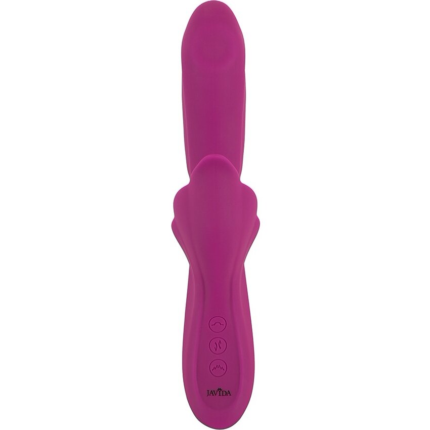 Vibrator dual JAVIDA cu 3 motoare: 7 trepte de împingere, 5 moduri de pulsații, 10 feluri de vibrație și încălzire rapidă. Silicon catifelat + ABS, cu acumulator USB, flexibil și silențios. Controale separate pentru combinații personalizate.
