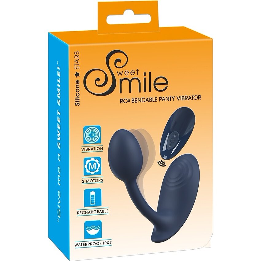 Vibrator pentru chiloți discret, Panty Flexibil Sweet Smile: 2 motoare pentru stârnire internă și clitoridiană, 10 maniere de vibrație, telecomandă până la 5 m, reîncărcabil USB. Silicon moale, stil pliabil și ambalaj eco-friendly.