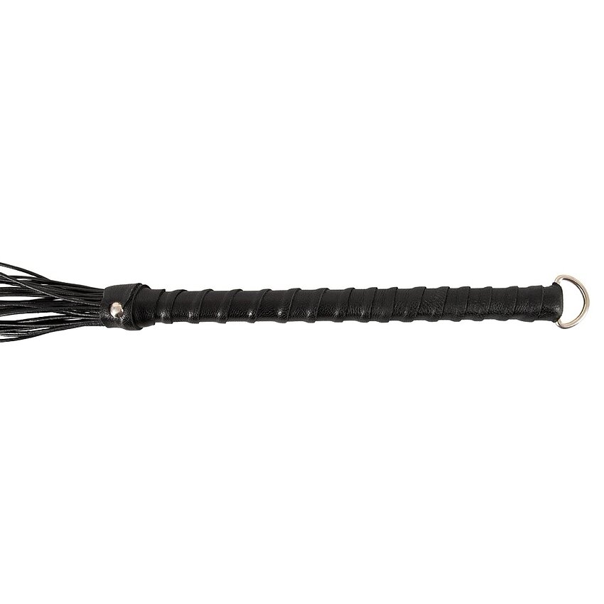 Flogger ZADO din piele naturală, 70 cm. Cingătoare rotunde subțiri cu vârfuri ascuțite, ansamblu de prindere îmbrăcat și inel pentru agățare. Recomandat pentru plesnire simplă și control precis.