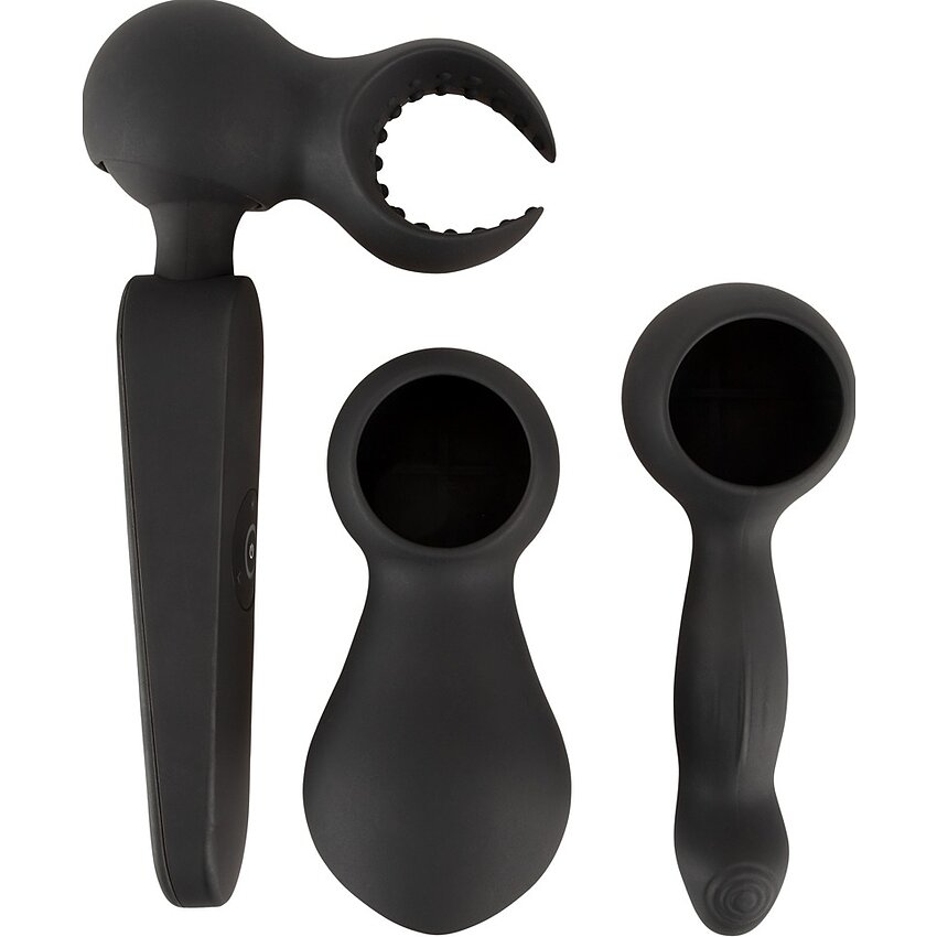 Setul include trei podoabe moi interschimbabile: penis virtual texturat (16 cm total, inserabil 10,5 cm, calibru max. 2,8 cm), masturbator închis cu texturi (13,5 cm, adâncime inserabilă 8,5 cm) și masturbator deschis elastic (11,5 cm, diametru 3,8 cm). Accesoriile se montează fără greutate și sunt concepute pentru masaj extern și utilizare intimă.