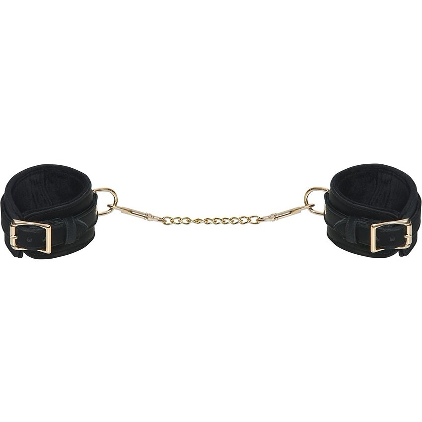 Caracteristici principale: - Finisaj catifelat închis la culoare cu detalii aurii - Ajustabile cu catarame pentru încheieturi între 22–28 cm - Lanț detașabil auriu, lungime 21 cm, cu cârlige pentru prindere rapidă - Margini cusute pentru rezistență în timp - Materiale: poliuretan, metal, poliester (textil)