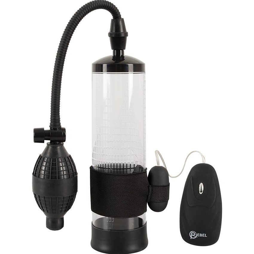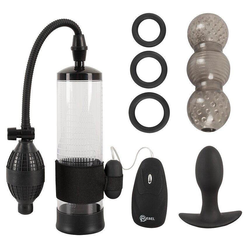 Set Rebel 7-în-1: colet complet pentru antrenament și satisfacție controlată — pompă măsurabilă cu supapă de siguranță, vibrator inserabil 12 moduri (3x AAA), plug stimulator 20 feluri reîncărcabil, masturbator extensibil și 3 inele.