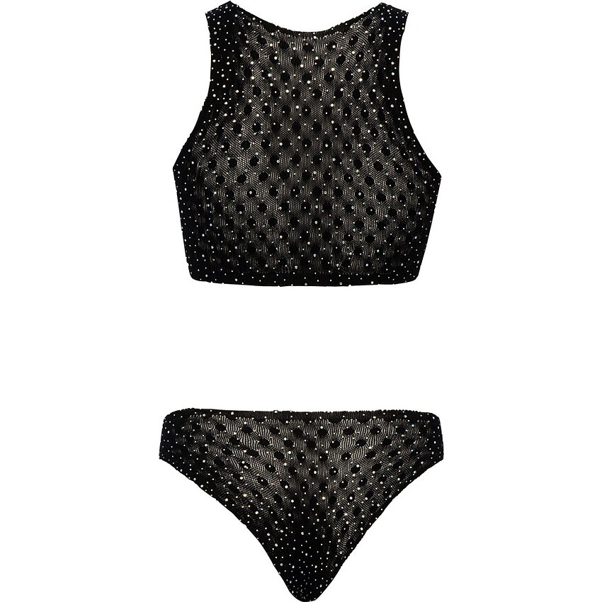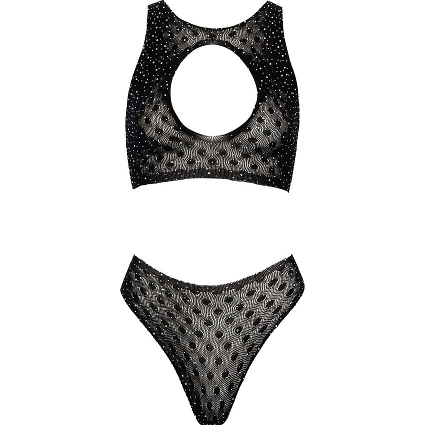 Set Fantezie Cottelli: top semitransparent cu decupaj la decolteu şi tanga, ambele acoperite cu strasuri mari. Material elastic, fără cusături evidente, extraordinar de confortabil. Dimensiune universală S-L. Compoziţie: 93% poliamidă, 7% elastan.