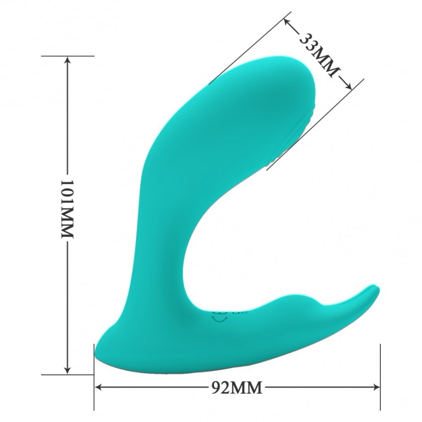 Pretty Love Idabelle Green este un stimulator purtabil, proiectat pentru stârnire duală: cap bulbous pentru punctul G și porțiunea externă pentru clitoris. Designul ergonomic se mulează pe corp pentru confort și precizie, iar forma compactă îl face discret la purtare.