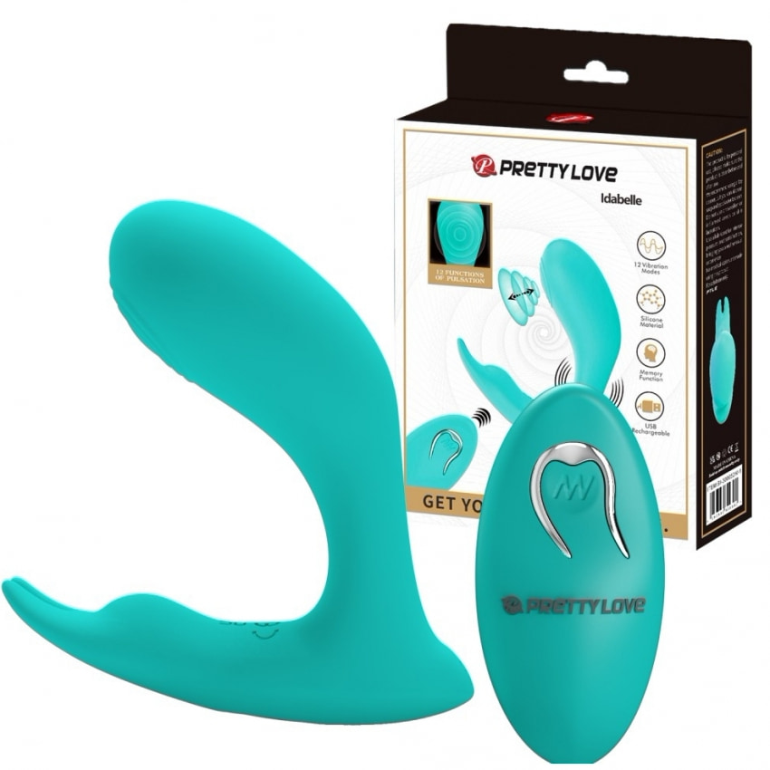 Stimulator purtabil Pretty Love Idabelle Green, control wireless prin telecomandă. Cap bulbous pentru stimulare punctuală a punctului G și partea externă pentru clitoris. Două motoare, 12 chipuri de vibrație și 12 setări de pulsație, memorie pentru asocierea preferată. Tenace la apă.