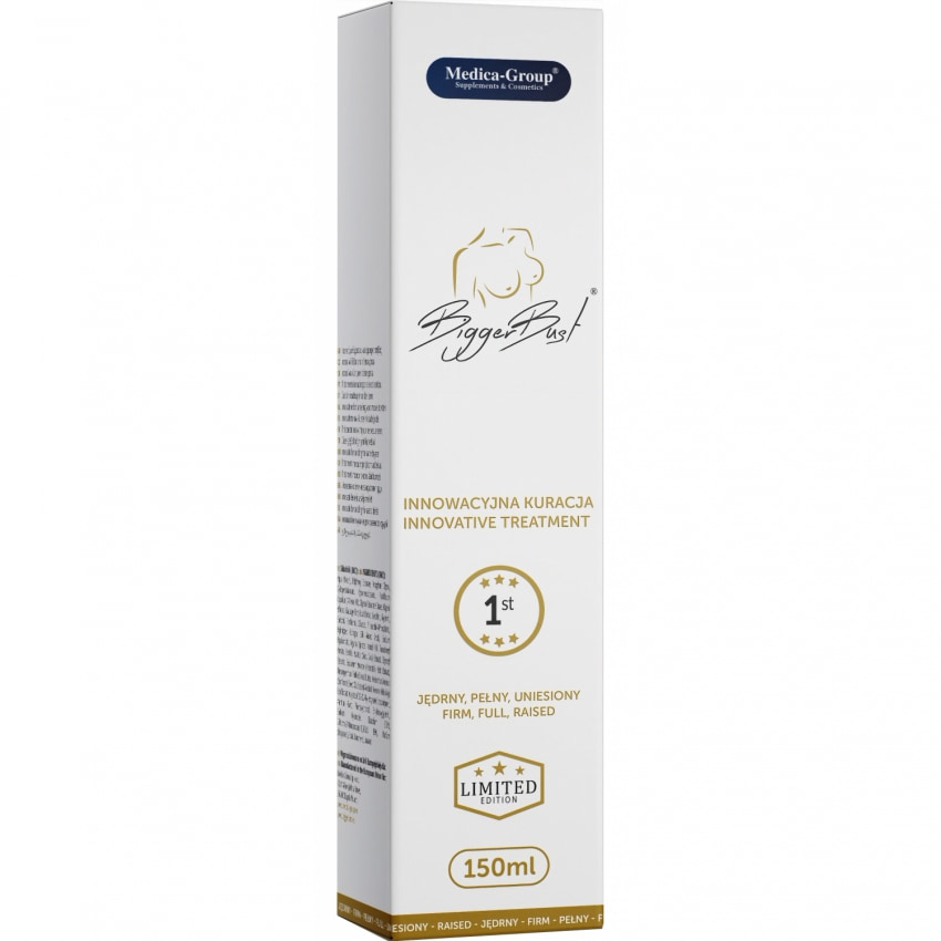 Ser-cremă Bigger Boost 150 ml de la Medica-Group susține fermitatea și mărirea, hidratează pielea din jurul sânilor. Textură lejeră, absorbție rapidă, combinație cu Kigelia, colagen hidrolizat, Centella și ulei de argan.