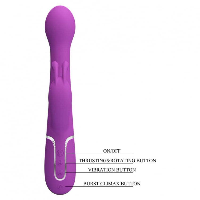 Pretty Love Dejon Bunny combină vibrațiile intense cu mișcarea mecanică pentru o stârnire precisă și susținută. Două motoare plasate strategic (vârful și brațul extern) furnizează sinergie între stimularea internă și cea externă. Rândul rigid de bile se mișcă vertical pe 3 trepte, iar unitatea de vibrație oferă 7 trepte și ritmuri variate. Butonul Burst permite impulsuri concentrate pentru schimbări rapide de intensitate.