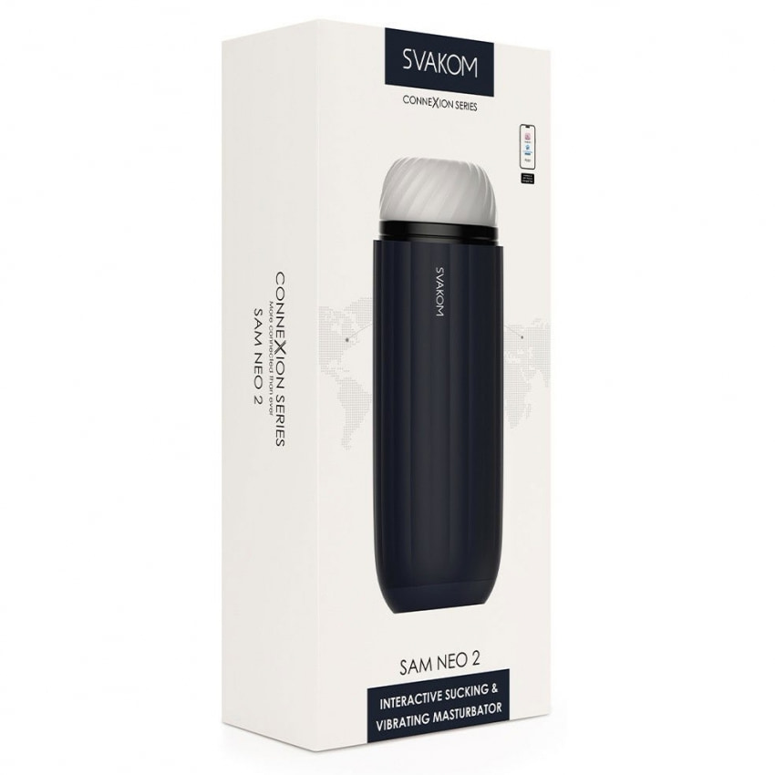 Sam Neo 2 de la Svakom, dispozitiv compact cu 15 feluri (5 suctiune, 5 vibraţie, 5 combinate), funcţie Extended O, control Bluetooth prin aplicaţie, manson detaşabil din TPE, USB reîncărcabil şi blocare pentru transport.