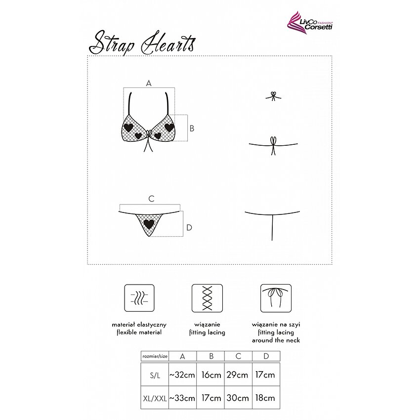 Setul STRAP HEARTS include: sutien, slip. Bunul este fabricat dintr-un material elastic si se potriveste marimilor S, M si L.
